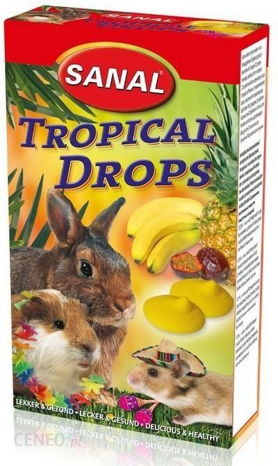 SANAL GRYZOŃ DROPS Tropical 45g• Dla królików, chomików i świnek morskich• Bez konserwantów, aromatów i barwników• Z bananem, marakują, morelą i ananasem Sanal Tropical Drops to pyszna przekąska dla Twojego małego zwierzaka.Idealny jako przysmak lub nagroda.