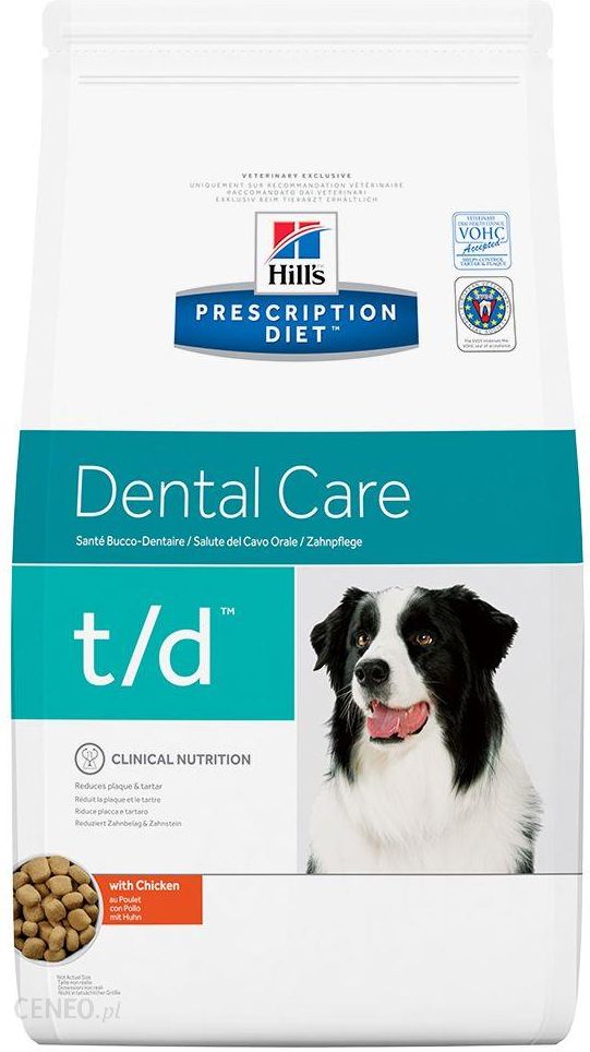 Hills Prescription Diet t/d Dental Care to karma opracowana specjalnie dla dorosłych psów, która dba o zdrowie jamy ustnej. Włókna roślinne wspomagają czyszczenie mechaniczne zębów podczas żucia. To karma, która ogranicza powstawanie kamienia nazębnego i przebarwień oraz zwalcza bakterie. Ponadto wspomaga higienę jamy ustnej i eliminuje przykry zapach z pyska. Hills Prescription Diet t/d Dental Care z kurczakiem (24%) to smaczny posiłek dla Twojego psa. Zawiera zrównoważoną zawartość składników odżywczych, przez co jest odpowiedni dla dorosłych psów. Wyważony skład karmy jest też bogaty w substancje witalne: witaminy, składniki mineralne oraz mikroelementy, takie jak beta-karoten i naturalne przeciwutleniacze. Te substancje zapewniają optymalny rozwój organizmu i wzmacniają odporność psa. Karma jest polecana przez lekarzy weterynarii, ponieważ dba o zdrowie jamy ustnej. Wskazania: Osad na zębach, przebarwienia, kamień nazębny Przykry zapach z pyska Zapalenie dziąseł Przeciwwskazania: Koty Szczenięta Suki w ciąży i karmiące Psy z ciężką chorobą przyzębia bez odpowiedniego badania i leczenia Hills Prescription Diet t/d Dental Care w skrócie: Karma podstawowa dla dorosłych psów o działaniu dowiedzionym klinicznie Stworzona, żeby dbać o zdrowie zębów i higienę jamy ustnej Czyszczenie mechaniczne: włókna roślinne sprzyjają oczyszczaniu zębów podczas żucia Higiena jamy ustnej: wpływa na ograniczenie powstawania kamienia nazębnego i przebarwień, zwalcza bakterie Wpływa na przykry zapach z pyska: wspomaga higienę jamy ustnej, eliminuje przykry zapach 24% kurczaka: cenne źródło białka zwierzęcego, karma jest lekkostrawna i smaczna Doskonale sprawdza się jako karma podstawowa: zrównoważona receptura, karma może być podawana przez całe życie Wyważony skład bogaty w substancje witalne: witaminy, składniki mineralne oraz mikroelementy, takie jak beta-karoten i naturalne przeciwutleniacze, zapewniają optymalny rozwój organizmu i wzmacniają odporność Polecana przez lekarzy weterynarii: karma często przepisywana przez lekarzy weterynarii, o działaniu dowiedzionym klinicznie