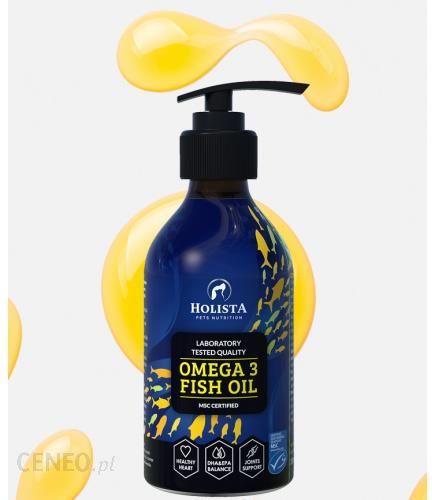 Certyfikowany olej pozyskiwany z dziko żyjących ryb morskich odznaczających się najwyższą zawartością kwasów Omega 3.Delikatny w smaku o łagodnym zapachu. Nie zawiera sztucznych konserwantów jest doskonale akceptowany przez psy i koty.Certyfikowany olej pozyskiwany z dziko żyjących ryb morskich odznaczających się najwyższą zawartością kwasów Omega 3 . Do osiągnięcia wysokiego poziomu kwasów omega 3 użyliśmy ryb z rodzin: Sardelowate (Engraulidae), Ostrobokowate (Carangidae), Śledziowate (Clupeidae) i Makrelowate (Scombridae (z wyjątkiem rodzajów Thunnus and Sarda)). Delikatny w smaku o łagodnym zapachu. Nie zawiera sztucznych konserwantów jest doskonale akceptowany przez psy i koty.HolistaPets Omega3 to złożona mieszanina triacylogliceroli (zwanych również triglicerydami), która charakteryzuje się wyjątkowo wysokim poziomem EPA i DHA, czyli w przybliżonej proporcji 18/12. Produkt nie zawiera sztucznych konserwantów, jest wolny od materiałów i komponentów modyfikowanych genetycznie. Pakowany w atmosferze azotu spełnia wszystkie przepisy UE dotyczące zanieczyszczeń w środkach spożywczych. odpowiednie dokumenty spełniają wszystkie wymagania stawiane przez krajowe organy regulacyjne dotyczące rejestracji leków.Wybierając HolistaPets masz pewność, że wszystkie produkty jakie podajesz swoim zwierzętom są czyste i spełniają najbardziej rygorystyczne międzynarodowe wymagania. Oleje rybne wytwarzane są w zakładach z certyfikatem FSSC 22000, który jest w pełni uznawany przez Globalną Inicjatywę Bezpieczeństwa Żywności dla ludzi (GFSI).Skład: 100% olej rybnySkład analityczny: wszystkie aktualne dane dostępne są w Certyfikacie Analizy [Kliknij]Sposób podania: odmierzoną za pomocą pompki dawkę oleju podawać z pokarmemDawkowanie Jedna pompka dozuje ok. 1,5 g oleju.Psy dorosłe: 1 pompka / 5 kg m.c.Koty: 1 pompkaPrzechowywanie: po otwarciu najlepiej przechowywać w lodówce nie dłużej niż 60 dniZastosowanie:- psy z problemami skórnymi, także chorobami atopowymi- suki ciężarne i w laktacji- psy aktywne- w przypadku problemów z aparatem ruchu- w przypadku problemów neurologicznych i behawioralnych (agresja, nadwrażliwość, nadreaktywność)WSPOMAGANIEPRACY SERCADOSKONAŁE PROPORCJEKWASÓW TŁUSZCZOWYCHWSPARCIEFUNKCJONOWANIA STAWÓWCERTYFIKATMSCKwasy Omega 3 wspomagają prawidłowe funkcjonowanie układu krwionośnego i nerwowego.Wyjątkowo wysoki i zbilansowany poziom EPA i DHA, czyli w przybliżonej proporcji 18/12.Kwasy Omega wspierają prawidłowe wydzielani mazi stawowej i funkcjonowania aparatu ruchu.Zasoby morskie pozyskiwane są przy użyciu zrównoważonych metod połowu.Holista Pets to polska marka, której celem jest tworzenie produktów żywieniowych dla zwierząt o najwyższym możliwym standardzie. Pragniemy dawać gwarancję ponad wszelką wątpliwość, że w misce Twojego zwierzaka znajdą się tylko certyfikowane, przebadane, czyste ekologicznie, pozyskiwane z odpowiedzialnych źródeł składniki. Wierzymy, że taki model żywienia może zapewnić zwierzętom dłuższe i zdrowsze życie. Podchodzimy także z szacunkiem i troską do miejsca w którym żyjemy dlatego wszystkie nasze opakowania nadają się w 100% do recyklingu. Wspieramy europejski przemysł nie stosując w produkcji naszych preparatów niskiej jakości komponentów chińskiego pochodzenia. HolistaPets to nie tylko zdrowsze żywienie to także holistyczny styl życia i troska o planetę, na której żyjemy.