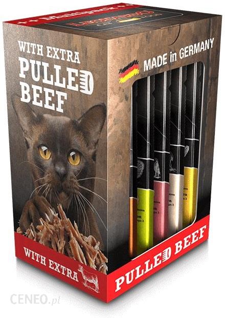 Cechy:- 5 różnych smaków uzupełnionych dodatkową porcją wołowiny.- Pysznie ugotowany przepis.- Z olejem z łososia, który dostarcza wielonienasyconych kwasów tłuszczowych dla zdrowej skóry i jedwabistych włosów.- Wyjątkowy smak i strawność.- Bez białka sojowego, cukru, barwników, sztucznych aromatów i konserwantów.- Bezzbożowa karma.Składniki:Wołowina: wołowina, serce, płuca (35,5%, z czego 14% to rozdarta wołowina), bulion (34,3%); mięso z kurczaka, wątróbka, Żołądek mięśniowy (29%); suszona skorupka jajka (0,5%); minerały (0,5%); olej z łososia (0,2%)Indyk: mięso z indyka, serce, wątroba, mięso mielone (34,5%); bulion (34,3%); rozszarpana wołowina (14%); wątróbka drobiowa (8,5%); płuco bydlęce (7,5%); suszona skorupka jajka (0,5%); minerały (0,5%); olej z łososia (0,2%)Jagnięcina: kurczak, wątróbka, skwarki (34,5%); bulion (34,3%); jagnięcina, serce, wątroba, płuca (16%); rozszarpana wołowina (14%); suszona skorupka jajka (0,5%); minerały (0,5%); olej z łososia (0,2%)Kaczka: mięso z kaczki, serce, wątróbka, miękisz (34,5%); bulion (34,3%); rozszarpana wołowina (14%); wątróbka drobiowa (8,5%); płuco bydlęce (7,5%); suszona skorupka jajka (0,5%); minerały (0,5%); olej z łososia (0,2%)Kurczak: mięso z kurczaka, wątróbka, serce, Żołądek mięśniowy(40%); bulion (33,8%); rozszarpana wołowina (14%); płuca bydlęce (11%); suszona skorupka jajka (0,5%); minerały (0,5%); olej z łososia (0,2%)Dodatki:Dodatki dietetyczne:Witamina D3 200 N.E.; Witamina E (octan alfa-tokoferolu) 50 mg; tauryna 1000 mg; mangan (jako siarczan manganu) 2 mg; cynk (jako monohydrat siarczanu cynku) 20 mg; jod (bezwodny jodan wapnia) 0,2 mgDawkowanie:2-3 saszetki dziennie dla dorosłych kotów (ok. 4 kg). Świeża woda pitna powinna być zawsze dostępna. Po otwarciu może być przechowywany w lodówce do 24 godzin.