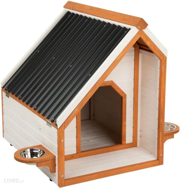 Produkty Modern Living przeznaczone są dla wymagających opiekunów zwierząt domowych, którzy świadomie poszukują przedmiotów wyrafinowanych i wytrzymałych. Wiemy, jak wiele wysiłku wymaga stworzenie idealnej przestrzeni i jaki nakład pracy jest potrzeby, żeby nadać wnętrzu charakter i styl. Harmonia jest naszą pasją. Produkujemy meble i akcesoria dla zwierząt domowych, wyróżniające się unikalnym i niezwykłym wzornictwem, które płynnie wtapiają się w najbardziej stylowy dom i zasługują w nim na wyjątkowe miejsce. Jednocześnie nigdy nie zapominamy o potrzebach Twoich zwierząt. Modern Living. This Harmonious Life. Wygodne mieszkanie dla wymagającego psa! Przytulne, funkcjonalne i niezwykle dekoracyjne: Modern Living buda dla psa Palma łączy kontrastowe barwy i asymetryczną budowę. Jest to stylowy element ogrodu i wygodne schronienie dla Twojego pupila. Wykonana z wytrzymałego materiału buda wyróżnia się przemyślaną koncepcją i trwałością. Obszerny przedsionek chroni zwierzę przed wiatrem i przeciągami, a wodoodporny dach z płyty falistej PVC sprawia, że wnętrze pozostaje suche. Składana połowa dachu umożliwia łatwy dostęp do wnętrza budy. Szczególnie wyrafinowanym elementem budy są dwa uchwyty na miskę, zawierające miski wykonane ze stali szlachetnej, które można zamontować w różnych pozycjach. Modern Living buda dla psa Palma w skrócie: Stylowa i nowoczesna buda dla psa. Unikalny design: czyste linie, efektowny wygląd, jasne, harmonijne kolory, kontrastowe elementy. Nowoczesna architektura – asymetryczny kształt dachu Wyjątkowo korzystny efekt optyczny. Stromy kąt nachylenia dachu dwuspadowego o różnych wysokościach okapu zapewnia szybkie odprowadzenie opadów i idealną wysokość wnętrza budy. W 100% odporny na warunki atmosferyczne dach z płyty falistej PVC Stabilne i wodoodporne pokrycie dachu gwarantuje niezawodną ochronę przed wpływem czynników atmosferycznych i nadaje budzie trwałość. Gładka powierzchnia sprawia, że woda deszczowa szybko spływa z dachu, a śnieg i liście się z niego osuwają. Przedsionek Zadaszony przedsionek stanowi większą ochronę przed wiatrem i przeciągami. Jest to również wygodne, chronione przed wpływem warunków atmosferycznych miejsce do jedzenia. Składana połowa dachu Szczególnie praktyczne rozwiązanie, jeśli chcesz szybko przewietrzyć lub wyczyścić budę. Po otwarciu dach można zablokować za pomocą haczyka. 2 uchwyty do misek: mogą być zamontowane w różnych pozycjach wewnątrz i na zewnątrz budy, zapobiegają ślizganiu się misek, miski znajdują się wyżej, dzięki czemu mrówki i ślimaki nie mają dostępu do karmy. 2 miski ze stali szlachetnej: wyjmowalne, higieniczne, można je myć w zmywarce. Antypoślizgowe gumowe nóżki: zapewniają prześwit i cyrkulację powietrza pod budą, stanowią ochronę przed zimnem i wilgocią. Łatwy montaż: wstępnie zmontowane elementy, mogą być połączone za pomocą kilku śrub. Materiał: Drewno: stroigła chińska. Dach: PVC. Kolor: Drewno: biały / jasnobrązowy. Dach: czarny. Wymiary: Tabela rozmiarów znajduje się w załączniku. Wskazówka dotycząca rozmiaru: Podane zalecenia dotyczące rozmiaru odpowiedniego dla danej rasy są niewiążącymi wskazówkami opartymi na standardowej wielkości psów danej rasy. Przy wyborze budy należy koniecznie wziąć pod uwagę indywidualną wielkość zwierzęcia. Porównaj podane wymiary wewnętrzne. Wymiary całkowite uwzględniają boczny uchwyt na miskę oraz przedsionek! Ważne! Buda dla psa nie powinna być za duża, ponieważ dzięki ciepłu swojego ciała pies wytwarza przyjemny klimat, który może zostać utrzymany tylko wtedy, gdy w budzie nie jest zbyt wiele wolnej przestrzeni. W zbyt dużej budzie istnieje ryzyko, że pies będzie marznął. Uwaga! Przedmiot został zabezpieczony nieszkodliwym środkiem do ochrony drewna na bazie wody. Takie rozwiązanie zapewnia początkową ochronę przed warunkami atmosferycznymi, ale budę należy regularnie konserwować, jeśli zostanie wystawiona na zewnątrz. Bez odpowiedniej pielęgnacji drewno wysycha i może stać się kruche, wypaczone lub nieestetyczne. Dlatego budę należy regularnie i dokładne czyścić i konserwować, używając przy tym produktów do pielęgnacji drewna/glazury, które są bezpieczne dla zwierząt. Ustawiając budę na zewnątrz, wybierz miejsce, które najlepiej ochroni ją przed niekorzystnymi warunkami atmosferycznymi.