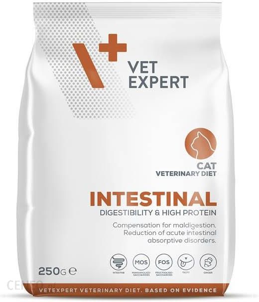 INTESTINAL CAT – sucha karma weterynaryjna dla kotów 250 gPełnoporcjowa, kompletna i zbilansowana karma dietetyczna dla kotów, której podawanie jest zalecane w przypadku zaburzeń trawienia i wchłaniania jelitowego. Wyrównuje zaburzenia trawienia i ogranicza zaburzenia wchłaniania. Karma o zwiększonej zawartości elektrolitów i wysokostrawnych składników.