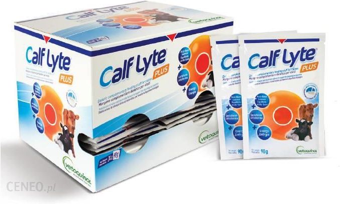 CALF-LYTE® PLUS stosuje się u cieląt w przypadku zagrożenia zaburzeniami trawiennymi (biegunką), w trakcie takich zaburzeń lub w okresie rekonwalescencji po ich przebyciu. Połączenie octanu sodu, elektrolitów i dekstrozy jest hipertoniczną (490 mOsm/l) dietetyczną uzupełniającą mieszanką paszową dla cieląt z zaburzeniami trawienia i biegunką. Po rozpuszczeniu roztwór nie zakłóca trawienia mleka i może być podawane cielętom ssącym i cielętom, które są karmione mlekiem ręcznie. W składzie produktu znajduje się również białko mleka w proszku (zawierające laktoferynę). Produkt nadaje się do podawania zarówno z wodą jak i mlekiem.Skład: dekstroza ( 60,5 %), octan sodu ( 18,3 %), chlorek sodu, chlorek potasu , fosforan sodu , fosforan dwupotasowy , białko mleka w proszku (zawierające laktoferynę) , cukier karmelizowany . Źródło węglowodanów : dekstroza.Składniki analityczne: cukier całkowity 60,5%, popiół surowy 17,7 %, białko surowe 12,0 %, sód 5,9 %, chlor k i 2,8 %, potas 1,7%, tłuszcz surowy 0,5 %, włókno surowe 0,5 %.Dodatki: konserwanty , substancje aromatyzujące : glicyna 90 400 mg/kg, spoiwa, witaminy i podobne dodatki.Cielęta : Rozpuścić 1 saszetkę ( 9 0g) w 2 litrach ciepłej wody ( 37 °C ) i podawać za pomocą butelki lub sondy żołądkowej. Podawać 2 litry świeżego roztworu 2 do 3 razy dziennie, osobno lub zmieszane z e zwykłą paszą (mlekiem lub preparatem mlekozastępczym).Czas stosowania : 1 do 7 dni, jeśli podawane z zwykła paszą . 1 do 3 dni jeśli podawane bez paszy, a następnie 1 dzień przejściowy podając CALF – LYTE ® PLUS z e zwykłą paszą. Przed użyciem lub przedłużeniem okresu stosowania zaleca się konsultację z lekarzem weterynarii. Nie rozpuszczać zawartości saszetki w mniej niż 2 litrach wody.UWAGA! Zgodnie z obowiązującymi przepisami, produkt jest dostępny do sprzedaży tylko w przypadku odbioru osobistego lub zlecenia odbioru w wybranej firmie kurierskiej. Produkty znajdujące się na liście OTC nie mogą być sprzedawane przez sklep do gabinetów weterynaryjnych oraz sklepów zoologicznych.UWAGA! Produkty lecznicze nie podlegają zwrotowi. Zwrot tego rodzaju produktów możliwy jest wyłącznie w przypadku wady jakościowej produktu lub jego niewłaściwego wydania. Podlega to regulacji art. 96 ustawy z dnia 6 września 2001r. – Prawo farmaceutyczne (Dz. U. z 2008r., nr 45, poz. 271).