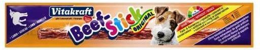 Vitakraft Beef Stick – przekąska mięsna z jagnięciną Beef Stick Original Lamm – przekąska mięsna z jagnięciną dla psówVitakraft Beef-Stick to wyjątkowa przekąska dla Twojego czworonoga. Aromatyczne paluszki zawierające 93% mięsa zachwycą Twojego psa. Smakołyki posiadają specjalne rowki, dzięki czemu niezwykle łatwo jest je podzielić na mniejsze części. Przysmaki Vitakraft doskonale się sprawdzą jako nagroda podczas treningu lub urozmaicenie codziennej diety. Przysmak posiada wyjątkowo wysoką jakość ze względu na to, że podczas produkcji zrezygnowano z dodawania do niej barwników, konserwantów i wzmacniaczy smaku. Vitakraft Beef-Stick nie zawierają cukru, zostały wzbogacone wartościowymi witaminami, dzięki czemu uchodzą za doskonałą i naturalną przekąskę. Paluszki są pakowane pojedynczo w szczelne opakowania. Każdy posiłek z paluszkami Vitakraft stanie się świeżym i aromatycznym doznaniem smakowym dla Twojego ulubieńca.Charakterystyka:z jagnięcinywysoka zawartość mięsa > 90%z wartościowymi witaminamidzięki rowkom łatwy do podzielenia bez cukru bez barwnikówbez konserwantówbez sztucznych wzmacniaczy smakuszczelne, praktyczne opakowanieSkład:mięso oraz produkty pochodzenia zwierzęcego (92,5% z czego minimum 6,0% stanowi jagnięcina)minerałyprodukty pochodzenia roślinnego (skrobia ziemniaczane)zboża (ryż) Składniki analityczne:białko surowe 30,0%zawartość tłuszczu 25,0%włókno surowe 3,0%popiół surowy 9,0%wilgotność 33,0%Dodatki dietetyczne/kg:witamina A (E672) 5.000 j.m.witamina D3 (E671) 500 j.m.Sposób stosowania:Podawać jako przekąskę pomiędzy głównymi posiłkami w całości, bądź podzielony na małe kawałki.Opakowanie: 12 g