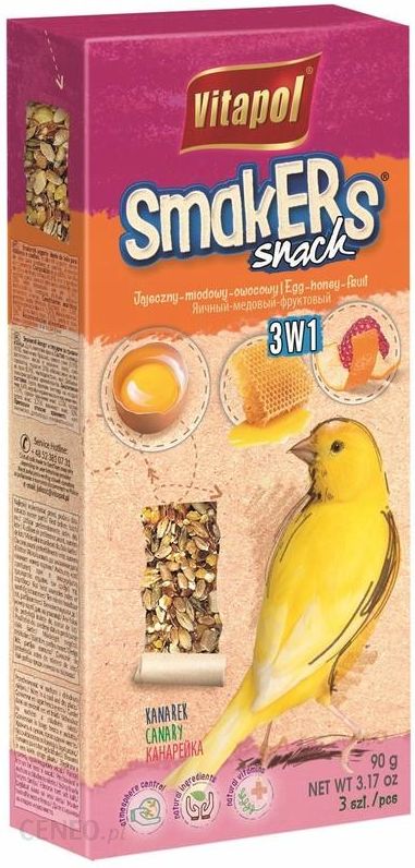idealnie uzupełnia codzienną dietę kanarkowtrzy oryginalne smaki w 1 opakowaniuw 80% wykonywane ręczniepoddawane niepowtarzalnemu na rynku procesowi suszenia w temperaturach nie przekraczających 65ºC przez kilka godzin. Brak stosowania wysokich temperatur umożliwia zachowanie większej ilości witamin i związków mineralnych ulegających rozpadowi w przypadku stosowania innych metod suszenia, jak np. wypiek.Smakers w trzech smakach do wyboru i to wszystko w jednym opakowaniu. Znajduje się tu jajeczny smakers dostarczający wartościowego białka kurzych jaj, niezbędnego w czasie lęgów i okresie pierzenia. Poza tym odżywczy smakers na bazie miodu, który oprócz właściwości leczniczych również wzmacnia organizm. Jak również smakers owocowy pełen naturalnych witamin i minerałów.Skład: miodowy: proso żółte, nasiona mozgi kanaryjskiej, proso czerwone, nasiona rzepiku, nasiona nigru, siemię lniane, mąka z ziarna pszenicy, jajeczny: proso żółte, nasiona mozgi kanaryjskiej, nasiona nigru, mąka pszenna, drożdże, jaja w proszku. Owocowy: proso żółte, mąka z ziarna pszenicy, nasiona mozgi kanaryjskiej, wiórki kokosowe, nasiona rzepiku, nasiona nigru, skórka pomarańczowa, malina, płatki róży, drożdże. Dodatki: barwniki.Zawartość składników analitycznych:białko surowe % (min) : 10,1oleje i tłuszcze surowe % (min) : 3włókno surowe % (max) : 8,3popiół surowy % (max) : 5wilgotność % (max) : 12Dawkowanie: Podawać codziennie.