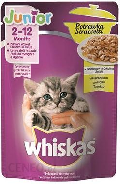 Whiskas wie, co Twój mały kotek kocha i czego naturalnie potrzebuje. Whiskas Junior z Kurczakiem w galaretce to starannie przygotowana, kompletna i zbilansowana, mokra karma dla kociąt (2-12 miesięcy). Whiskas Junior z kurczakiem to pokarm pełnoporcjowy, więc zaspokoi wszystkie potrzeby żywieniowe Twojego kota, zapewniając mu potrzebną energię i niezbędne składniki odżywcze. Mokra karma Whiskas Junior została specjalnie opracowana, aby dostarczyć małemu kotu wszystko czego potrzebuje, by wyrosnąć na zdrowego i silnego kota. Whiskas Junior zawiera wapń, by dbać o budowę zdrowych kości oraz witaminę E i minerały, by wspierać silny system odpornościowy. Pokarm Whiskas Junior to pożywne, pozbawione sztucznych dodatków smakowych, kolorantów i konserwantów mięsne kąski, które Twój kot instynktownie pokocha. Dzięki ulepszonej recepturze mokra karma Whiskas jest jeszcze smaczniejsza. Skład: mięso i produkty pochodzenia zwierzęcego (25%, w tym 4% kurczaka), roślinne ekstrakty białkowe, substancje mineralne, cukry. Analiza: białko 8%, tłuszcz 6%, popiół 1.6%, włókno 0.2%, wilgotność 85.5%, wapń 0.3%. Składniki: mięso i produkty pochodzenia zwierzęcego (42%, z czego 94% naturalnego pochodzenia, w tym 4% wołowiny), oleje i tłuszcze, zboża, substancje mineralne (0.5%), cukry. Analiza: białko 13.5%, tłuszcz 3%, popiół 1.2%, włókno 0.33%, wilgotność 81%. Dawkowanie: Kocię w wieku do 3 miesięcy potrzebuje 2 saszetek karmy mokrej i 20 g karmy suchej dziennie, kocię w wieku 4-5 miesięcy potrzebuje 2 saszetek karmy mokrej i 25 g karmy suchej dziennie. Zalecamy podawać zwierzęciu karmę pełnoporcjową Whiskas mokrą oraz suchą. Uwzględnij okres przejściowy i dostosuj ilości karmy, dzieląc ją na posiłki stosowne do potrzeb zwierzęcia. Zapewnij świeżą wodę do picia. Karmę podawać o temperaturze pokojowej. Niewykorzystaną część przechowywać w lodówce do 2 dni.
