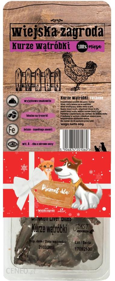 Kurze wątróbki Zawierają wszystkie witaminy z grupy B, w szczególności witaminę B12 , która jest znana z dobroczynnego wpływu na kondycję i elastyczność skóry, a także poprawia system odpornościowy psa. Witamina A wspiera zdrowie oczu, a białko kurczaka doskonale wpływa na budowę i rozwój mięśni. Wątróbki są także cennym źródłem żelaza, miedzi oraz cynku. Uzupełniający posiłek dla psów i kotów. Skład: 100% świeże kurze wątróbki Skład analityczny: białko (min) 67.42%, tłuszcz (max) 14.66%, wilgotność (max) 13.13%, popiół (max) 4.63% włókno surowe (max) 0.16% Pamiętaj o zapewnieniu psu dostępu do świeżej wody. Przechowuj w suchym i chłodnym miejscu poza bezpośrednim działaniem słońca. Nie nadaje się do spożycia przez ludzi.