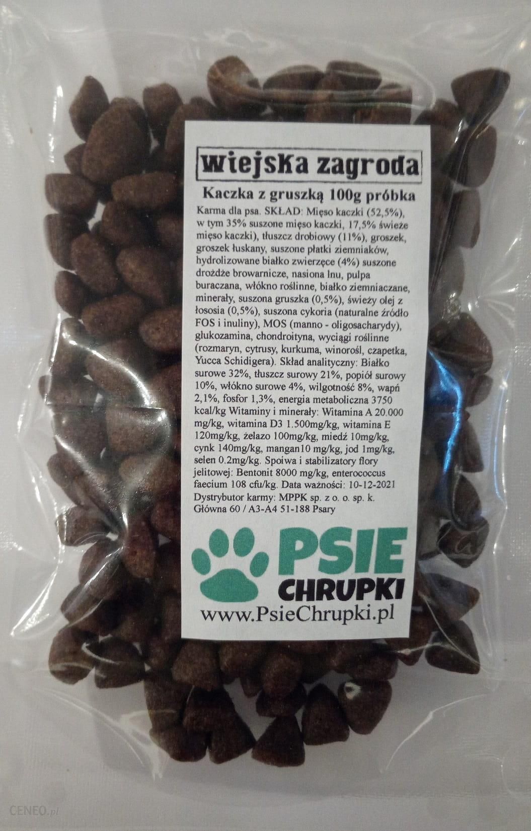 Próbka Kaczka z gruszką 100g Wiejska ZagrodaWiejska Zagroda KACZKA Z GRUSZKĄFormułę z mięsem wyłącznie z kaczki polecamy szczególnie psom aktywnym, które potrzebują porządnejdawki odżywczego białka i tłuszczu. Regionalna kaczka w połączeniu z gruszką to kompozycja dla nawet najwybredniejszych smakoszy.- bez zbóż- 68% mięsa z dodatkiem oleju z łososia- 32% warzyw, owoców, ziół i witamin- smakowitamięso kaczki – doskonałe źródło lekkostrawnego i odżywczego białka, wspiera odporność dzięki zawartości fosforu, żelaza, potasu oraz witamin z grupy A, B i Egruszki – źródło m.in. potasu ważnego dla układu nerwowego i zdrowych mięśni, wspomagają trawienieSkład: Mięso kaczki (52,5%), w tym 35% suszone mięso kaczki, 17,5% świeże mięso kaczki), tłuszcz drobiowy (11%), groszek, groszek łuskany, suszone płatki ziemniaków, hydrolizowane białko zwierzęce (4%) suszone drożdże browarnicze, nasiona lnu, pulpa buraczana, włókno roślinne, białko ziemniaczane, minerały, suszona gruszka (0,5%), świeży olej z łososia (0,5%), suszona cykoria (naturalne źródło FOS i inuliny), MOS (manno – oligosacharydy), glukozamina, chondroityna, wyciągi roślinne (rozmaryn, cytrusy, kurkuma, winorośl, czapetka, Yucca Schidigera)Skład analityczny: Białko surowe 32%, tłuszcz surowy 21%, popiół surowy 10%, włókno surowe 4%, wilgotność 8%, wapń 2,1%, fosfor 1,3%, energia metaboliczna 3750 kcal/kgWitaminy i minerały: Witamina A 20.000 mg/kg, witamina D3 1.500mg/kg, witamina E 120mg/kg, żelazo 100mg/kg, miedź 10mg/kg, cynk 140mg/kg, mangan10 mg/kg, jod 1mg/kg, selen 0.2mg/kgSpoiwa i stabilizatory flory jelitowej: Bentonit 8000 mg/kg, enterococcus faecium 108 cfu/kgDAWKOWANIE: